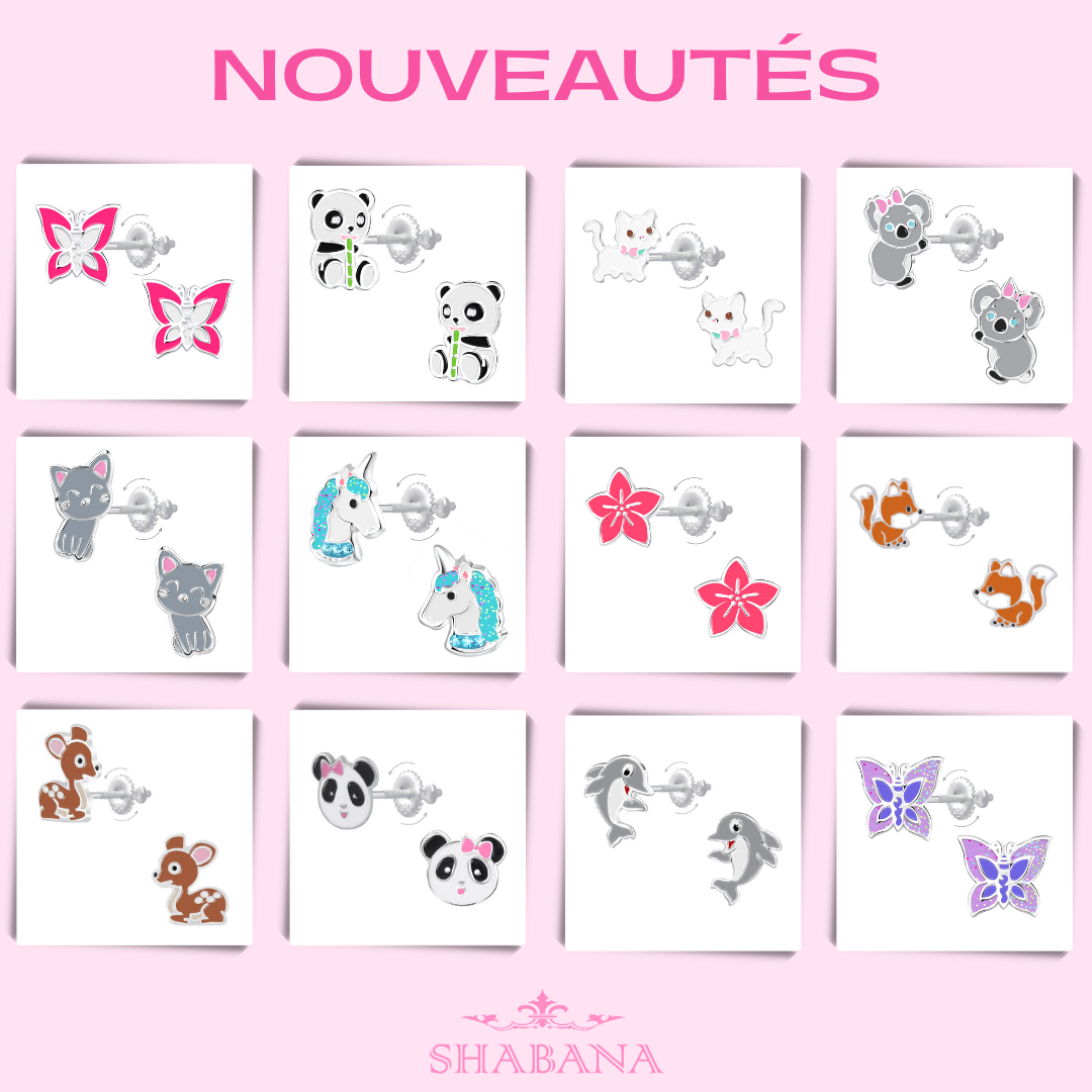 Des papillons, panda, fleurs, dauphins et autres motifs viennent compléter la collection spéciale pour les petites filles. Ces bijoux sont fabriqués en argent 925, sans nickel ni plomb. De quoi faire plaisir aux parents qui souhaitent diminuer le risque de perte des boucles d'oreilles grâce au système d'attache à vis.